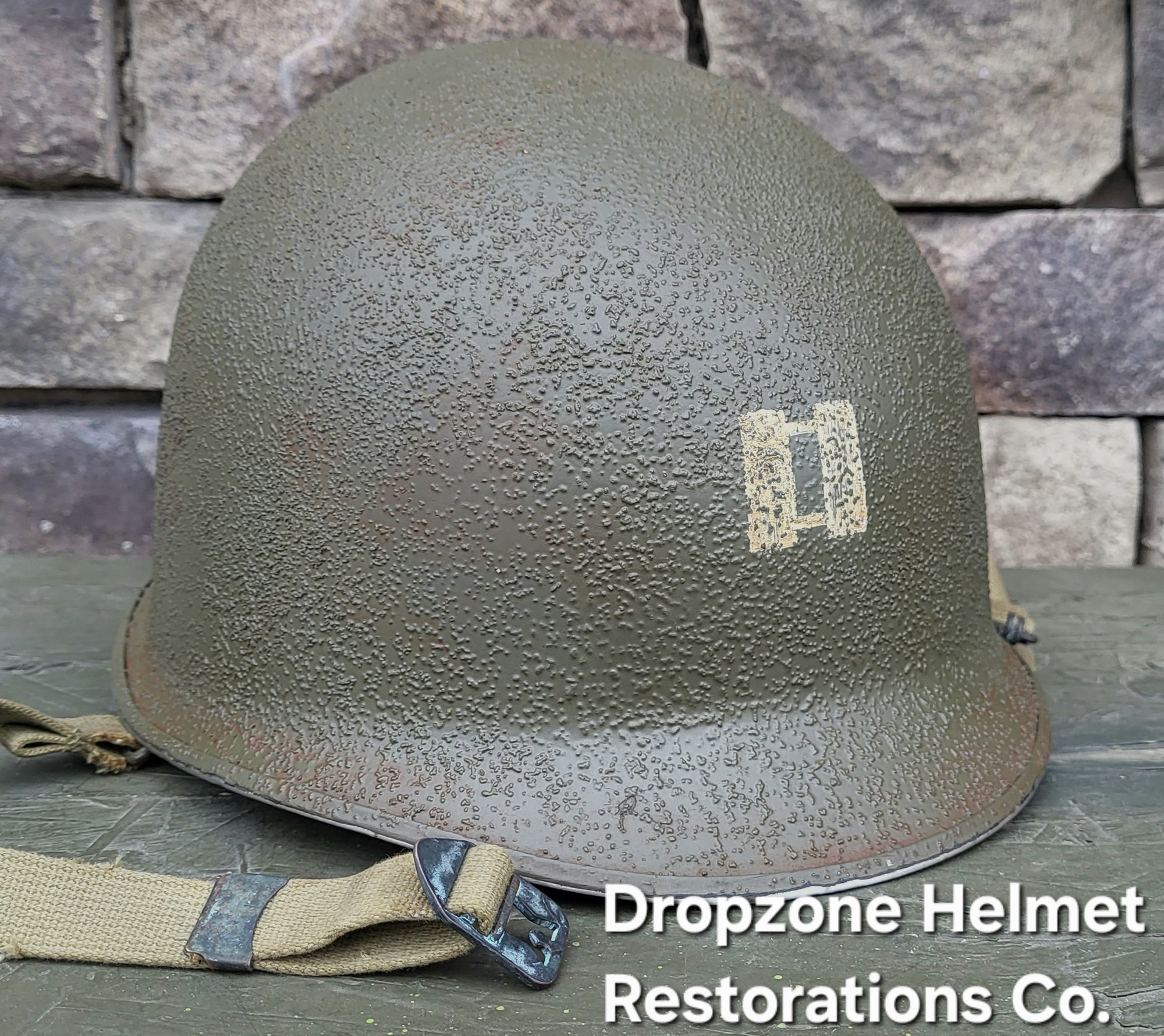 For your consideration is a Norwegian M1 style helmet that has been fully restored in the exact same fashion as all Dropzone Helmets are. New texture, OD paint, Jmurrayinc1944 chinstraps. The 2nd Ranger Bn & Captain rank markings were hand painted By Me, then aged & weathered for a "Combat Worn" appearance.