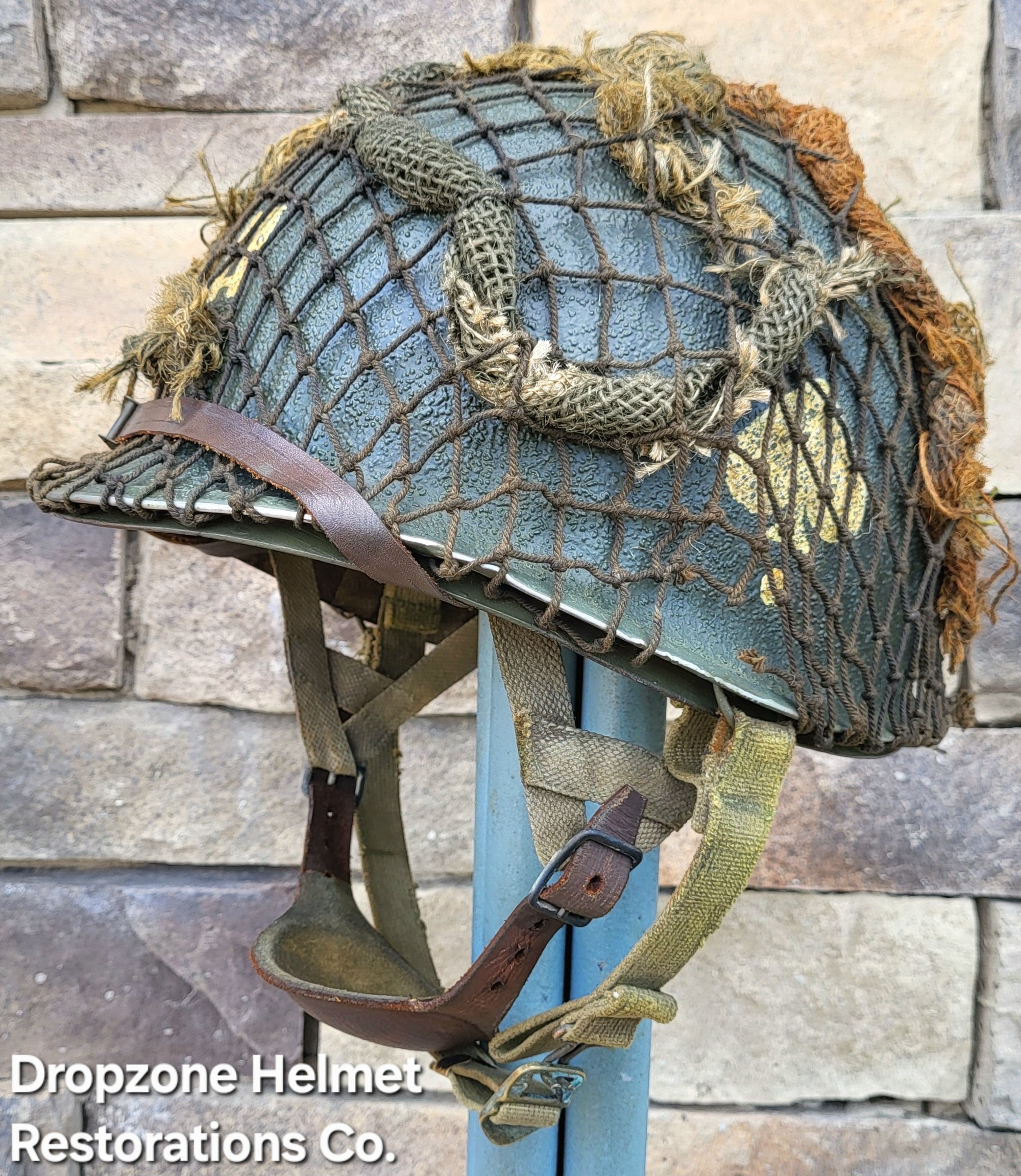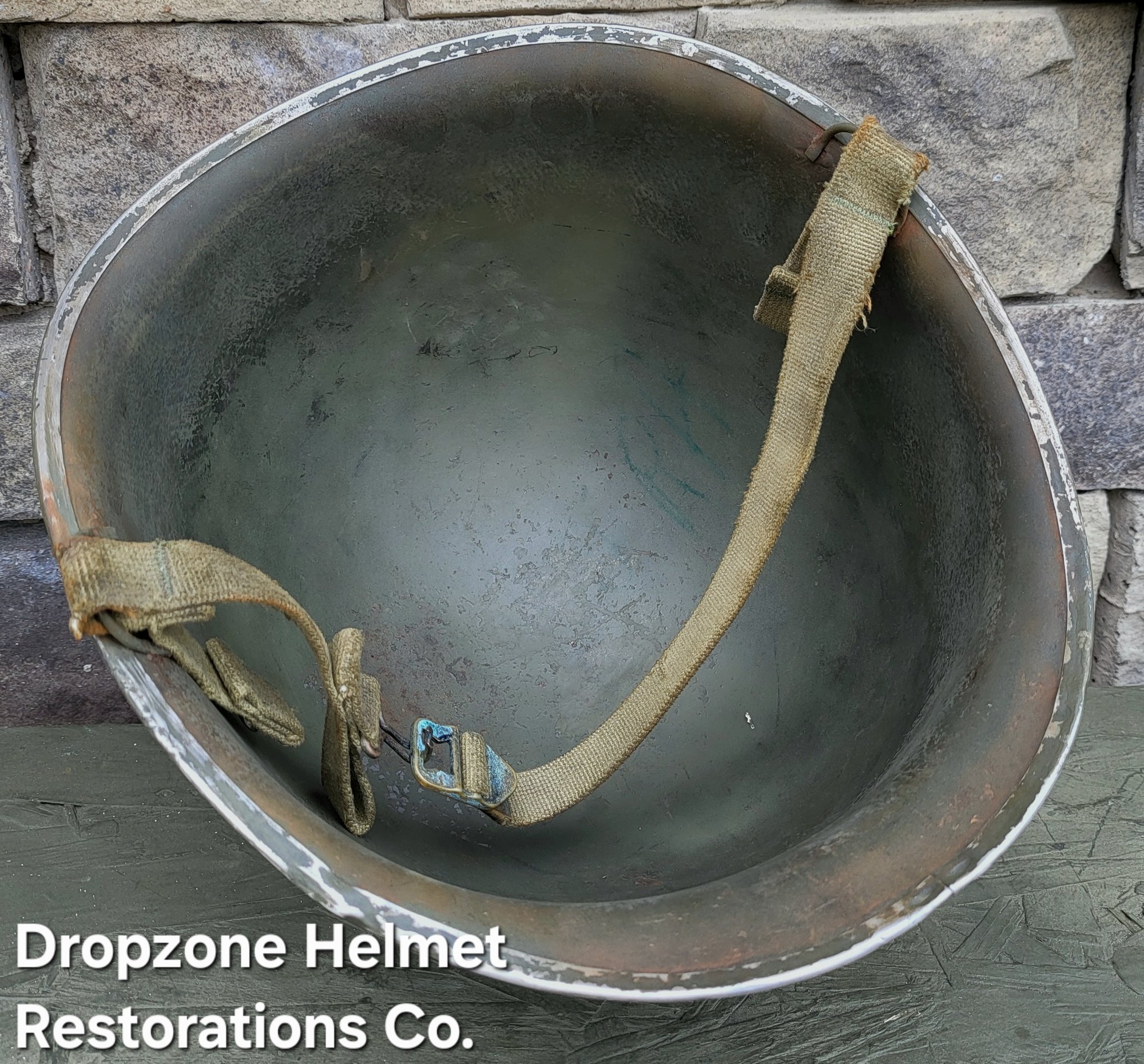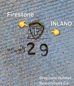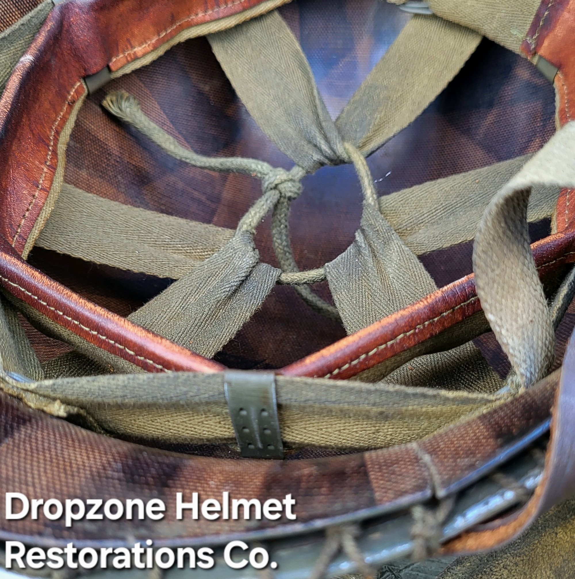 LINER: This a RARE Firestone-INLAND liner has been restored as an Airborne model. HBT webbing, A-washers, nape strap, tie-string, early "double-wire" sweatband, A-yokes w/wire buckles & liner chinstrap plus leather chincup are highly detailed/aged repro's. The drawstring helmet net & burlap scrim are included! The liner body is 80+ years old, not minty but still in good shape, see all pics!