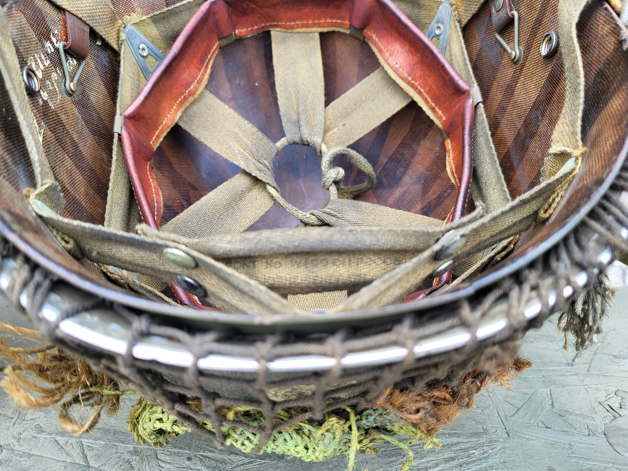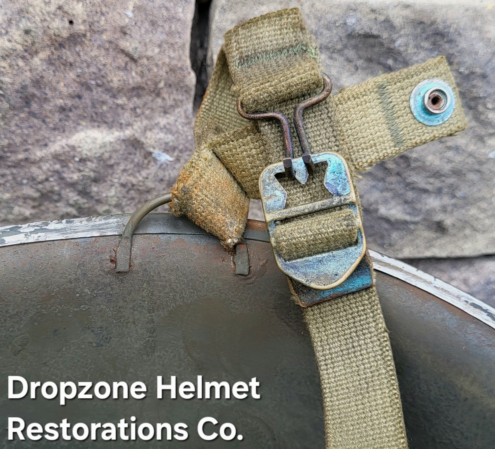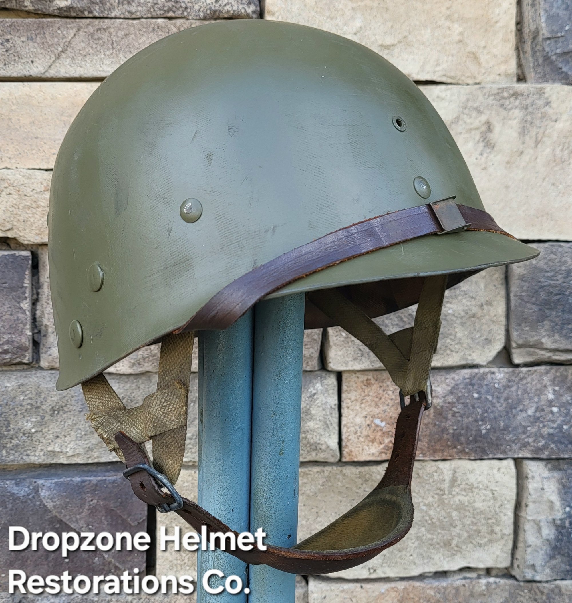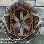LINER: This a RARE Firestone-INLAND liner has been restored as an Airborne model. HBT webbing, A-washers, nape strap, tie-string, early "double-wire" sweatband, A-yokes w/wire buckles & liner chinstrap plus leather chincup are highly detailed/aged repro's. The drawstring helmet net & burlap scrim are included! The liner body is 80+ years old, not minty but still in good shape, see all pics!