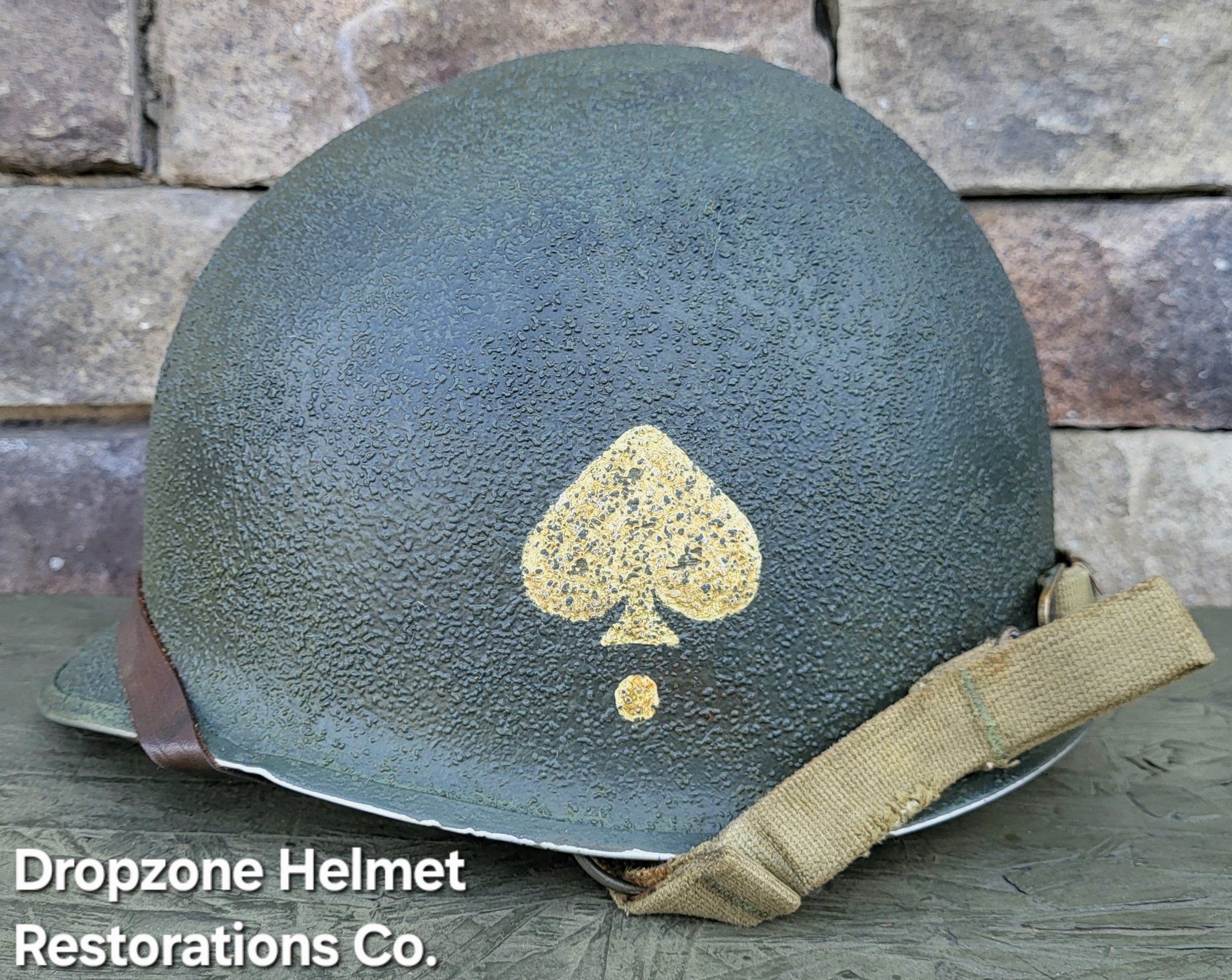 HELMET: WWII McCord Front Seam D-bale shell. M2 chinstraps with early war cast buckle. The 506th Spades & Captain rank were hand painted & aged to look like a "Heavy Combat Worn" helmet. Steel pot is in good but used condition. Heat stamp is: 236A (The new bales were properly spot welded on by Me.)
