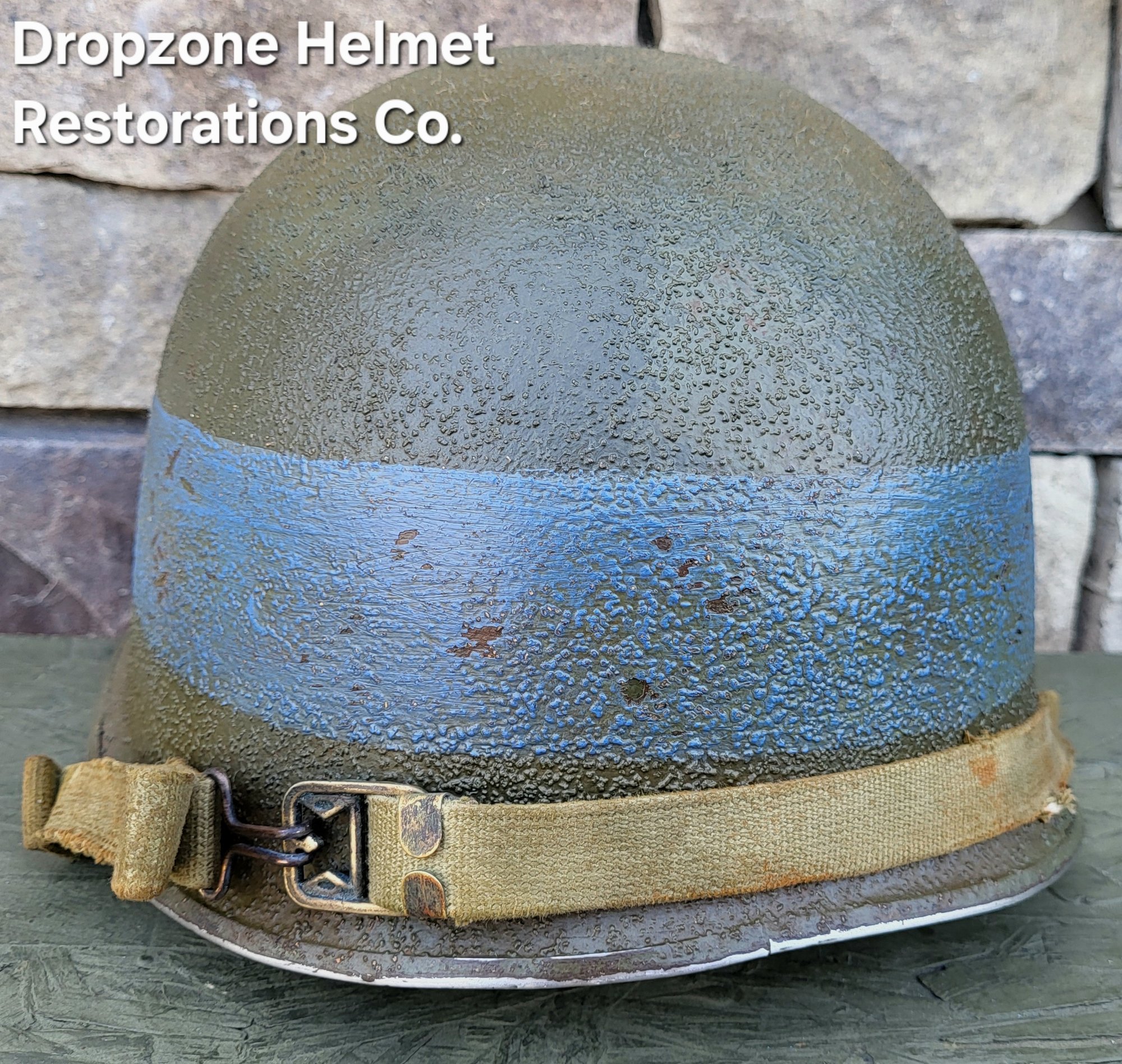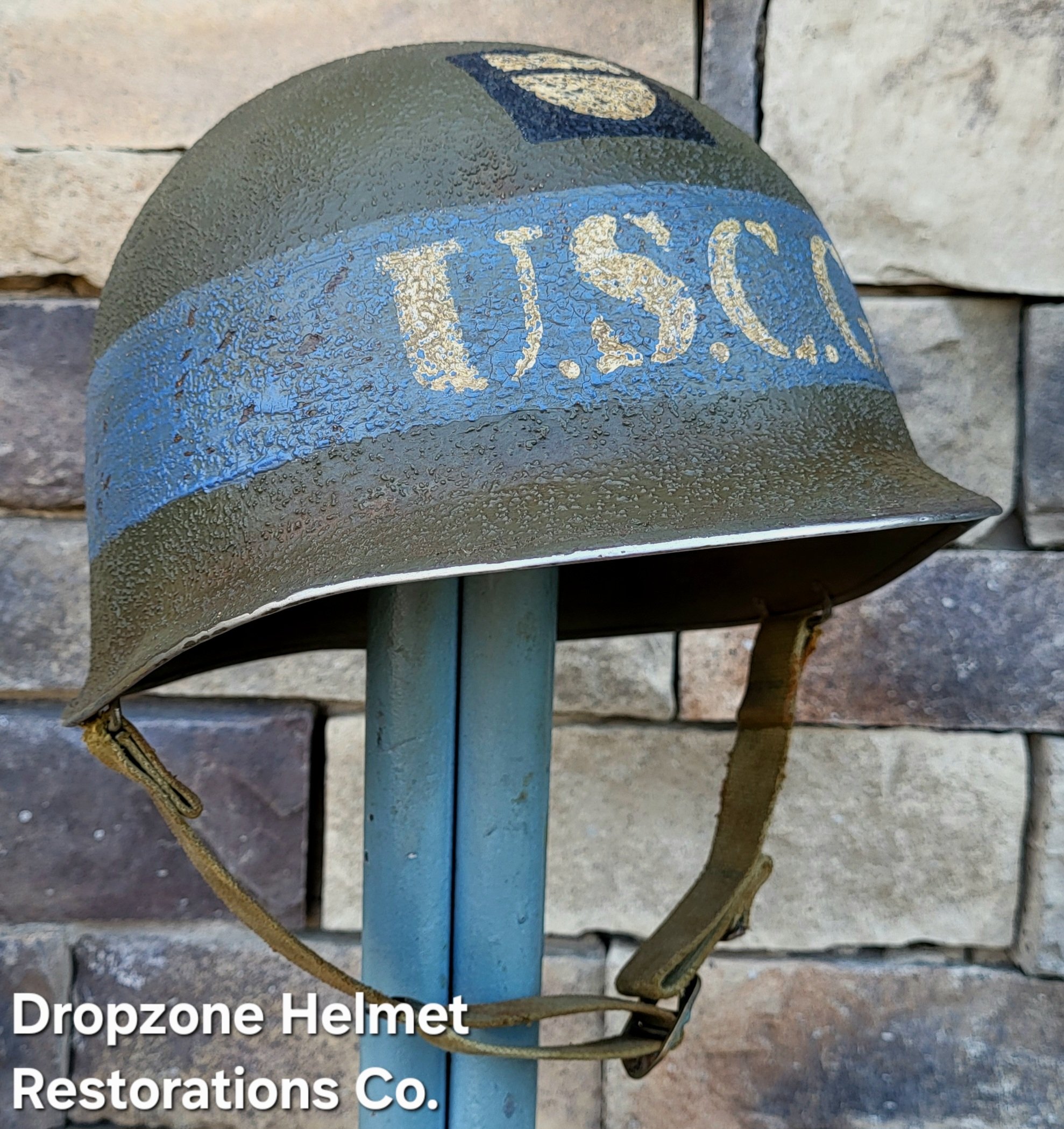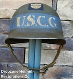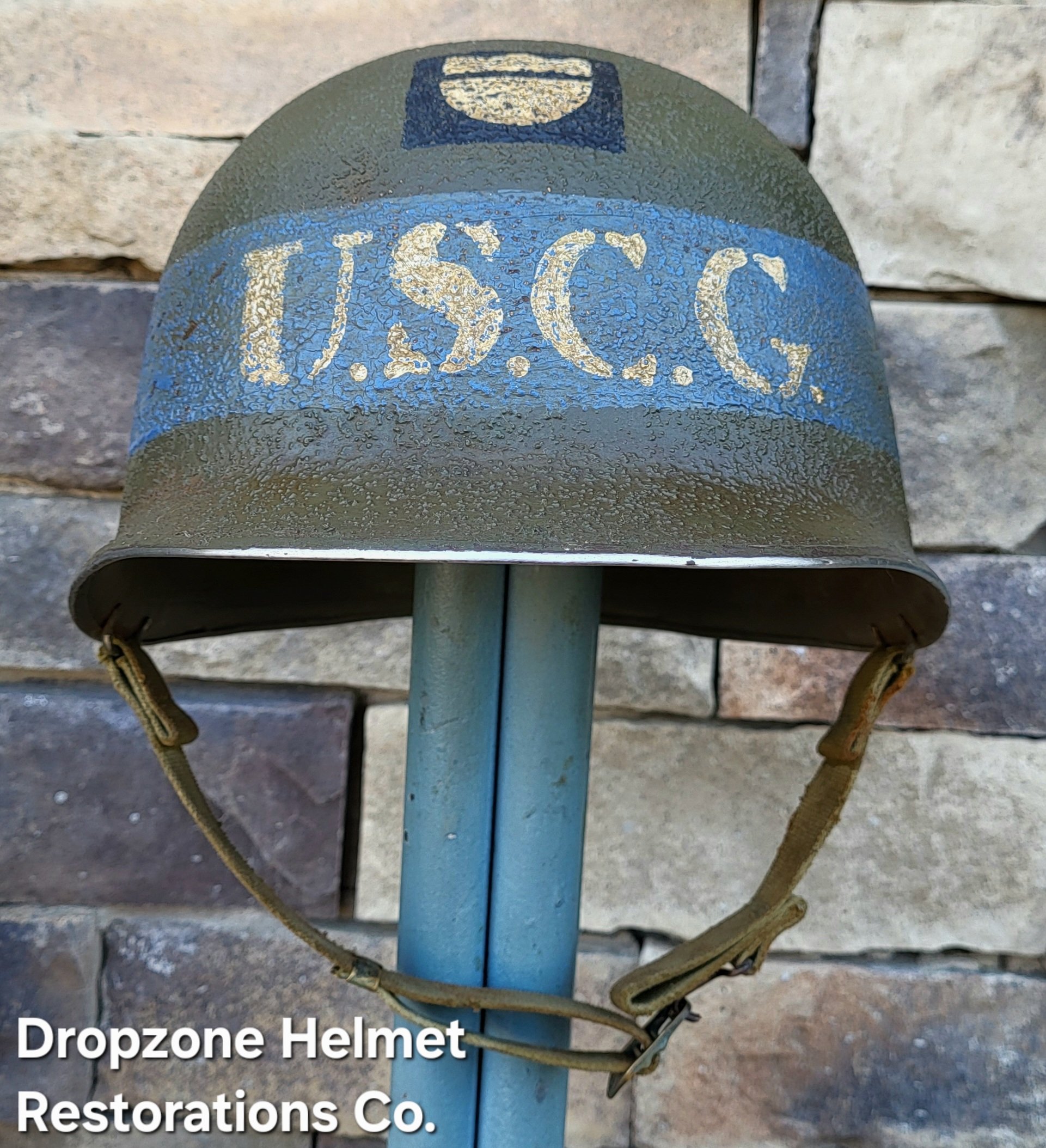 For your consideration is a Norwegian M1 style helmet that has been fully restored in the exact same fashion as all Dropzone Helmets are. New texture, OD paint, Jmurrayinc1944 chinstraps. The United States Coast Guard (USCG) markings were hand painted By Me, then aged & weathered for a "Combat Worn" appearance. The new fixed bales are a spot match to originals.